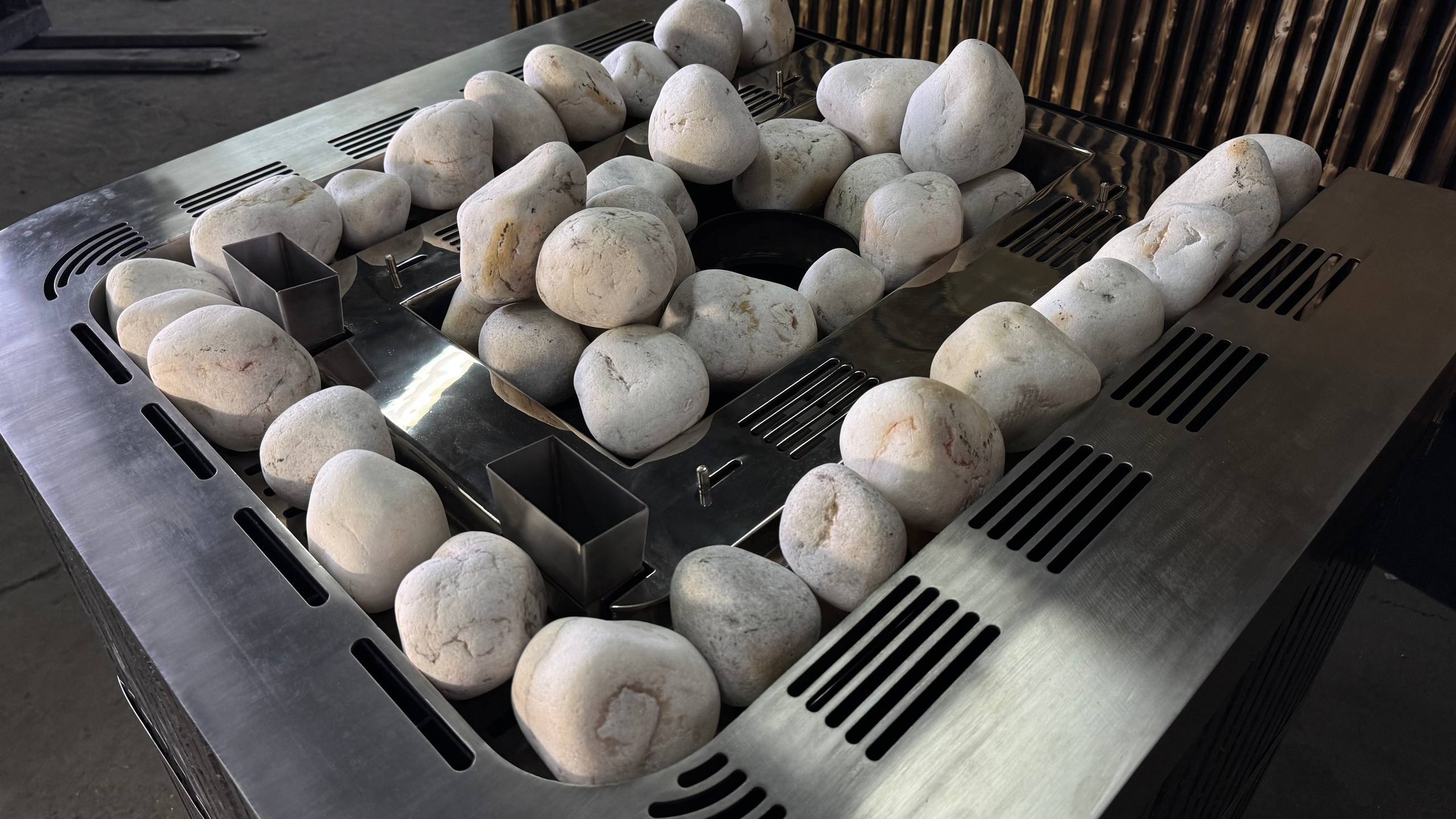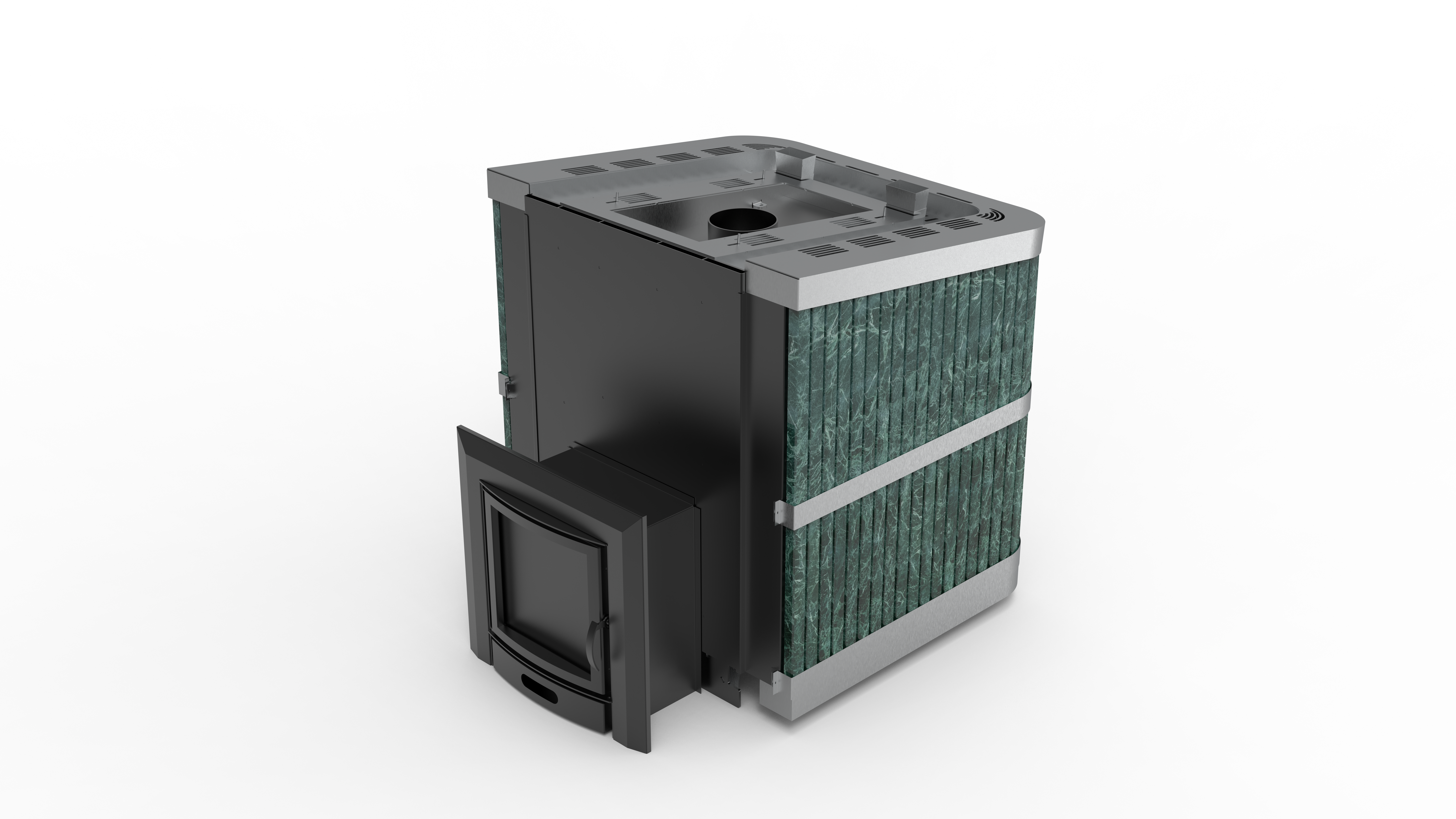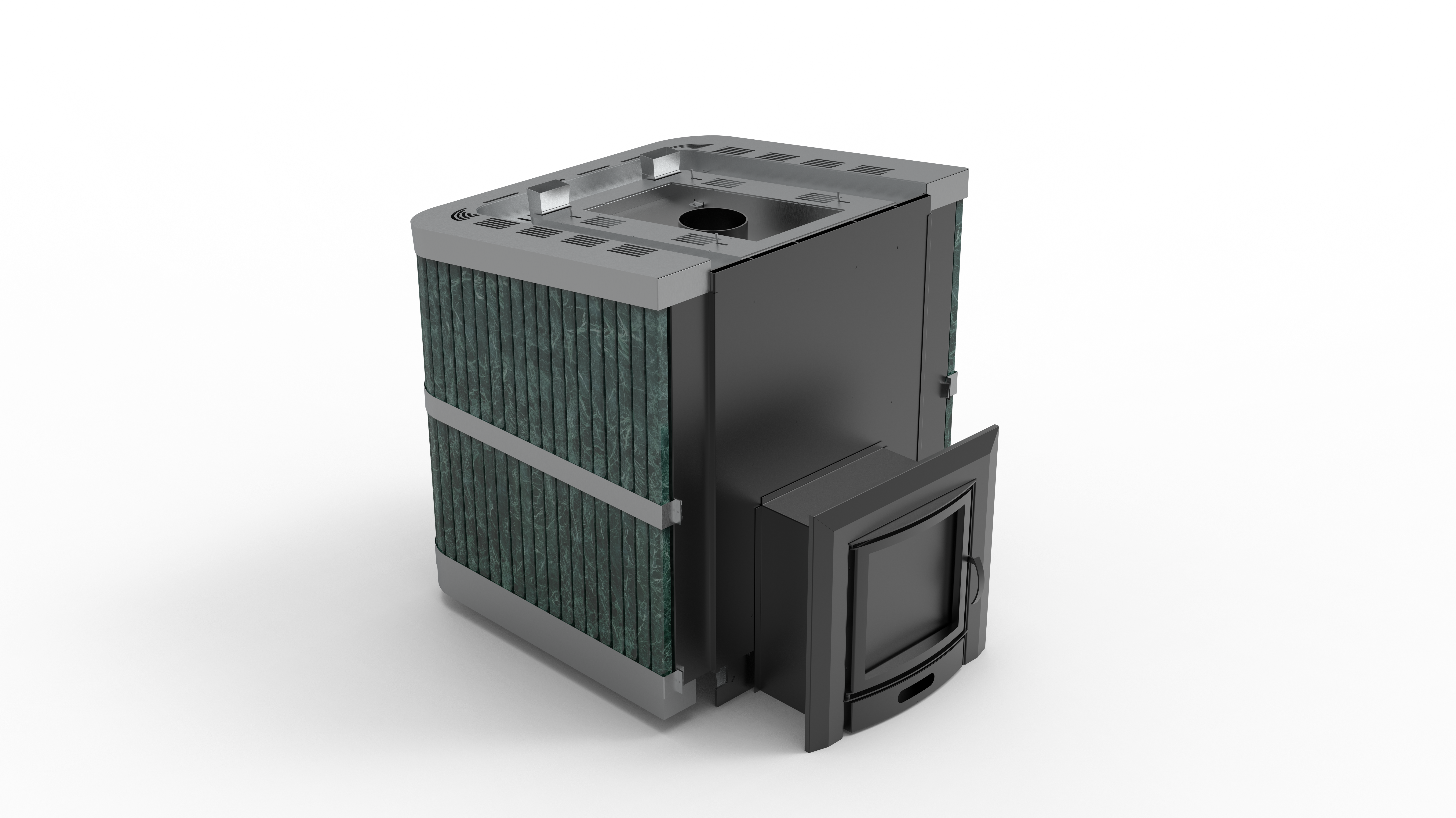 Основной пар формируется от закрытой каменки. Температура внутри каменки может достигать 600 °C, что обеспечивает получение плотного, мелкодисперсного пара, близкого к классическому «русскому». Масса камней в закрытой каменке составляет 200–240 кг, благодаря чему печь уверенно держит тепло и позволяет проводить подряд несколько сеансов парения без остывания.