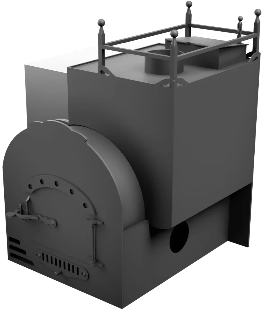 Закрытая каменка с дверцей для подачи пара. Такая каменка дает эффект «русской бани» Камни расположены внутри каменки и нагреваются до более высокой температуры в сравнении с открытой каменкой и остаются дольше горячими.