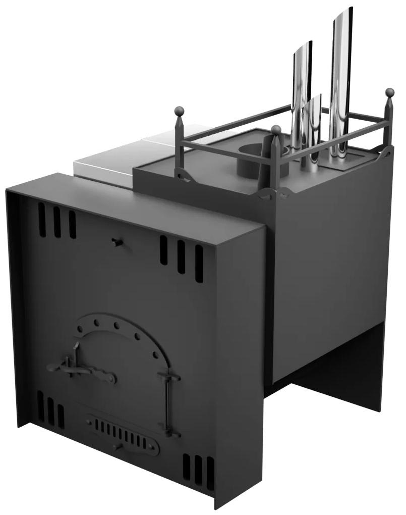 А так же печь укомплектована естественной системой воздушного отопления (ЕСВО) – эта система способна обогреть комнату отдыха до 20м3. Передний фланец печи оборудуется коробом (700х700мм) – порталом, по низу в углах расположены отверстия, для забора холодного воздуха. Этот воздух попадает в портал и нагреваясь выходит через верхнюю шибер-задвижку над топкой.