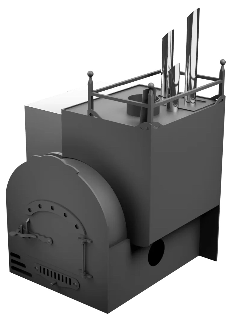 В комплектации данной модели предусмотрена система воздушного отопления (СВО), которая способна обогреть комнату отдыха до 40 м3. В конструкции печи предусмотрен дополнительный контур. Система подключается к электричеству, вентилятор подает холодный воздух, который прогреваясь от печи выходит в комнату отдыха. В комплект входит: вентилятор, гофрированная труба 1 метр, хомуты и обратный клапан.